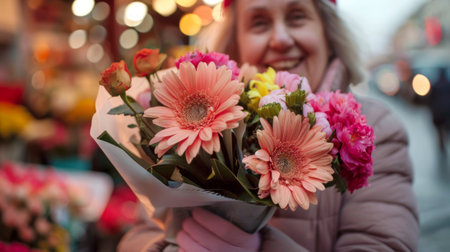 Elderly white woman holding a bouquet of colorful flowers outdoors. Concept of senior lady, floral arrangement, joy, nature appreciation.