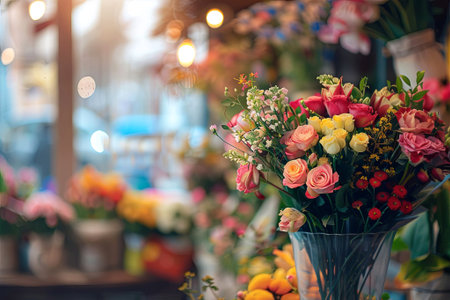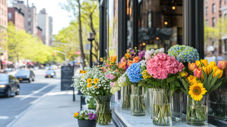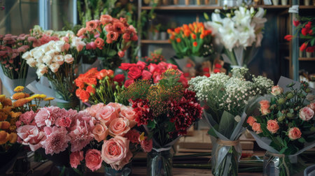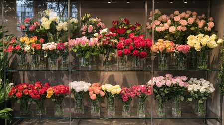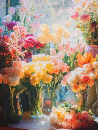 Brightly colored bouquets of roses, tulips, and daisies fill glass vases in a cheerful floral shop, showing natures beauty in springtime.