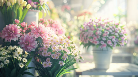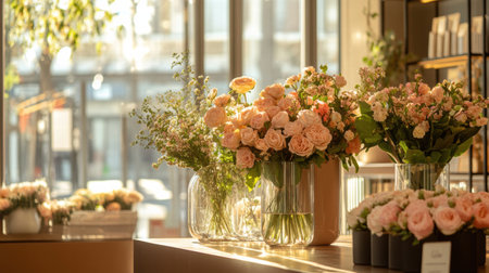 A charming flower shop filled with bright light showcases elegant bouquets of roses and mixed blooms in soft pastel colors.