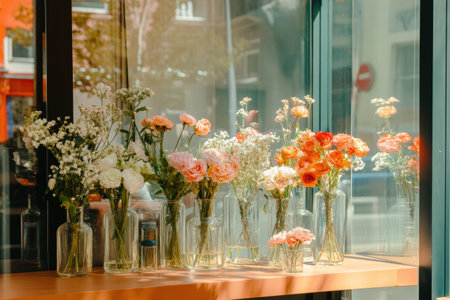 In a bright shop window, various colorful flowers in glass vases create a charming arrangement as sunlight filters through.