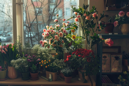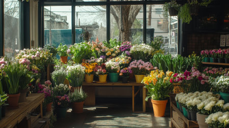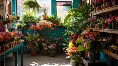 Warm sunlight filters through a quaint flower shop, highlighting an array of vibrant flowers and plants