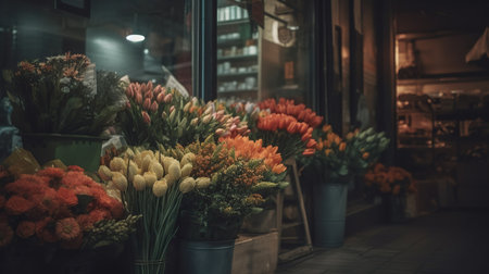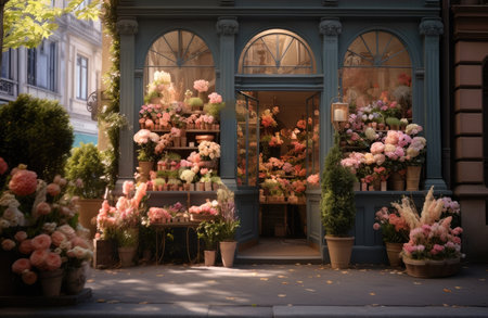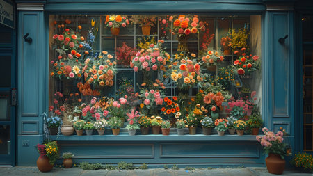 Flower shop front beautifully decorated with vibrant blooms and greenery, perfect for urban gardening and retail design concepts. With Generative AI technology.