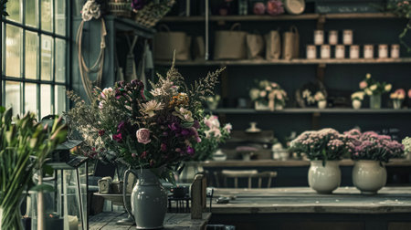 A cozy shop interior with decorative flower arrangements in vases and pots, creating a warm and inviting atmosphere, perfect for home decor and lifestyle content.