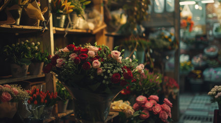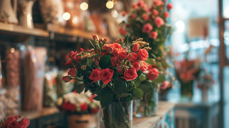 A bouquet of red roses displayed in a cozy flower shop, creating a warm and inviting atmosphere.
