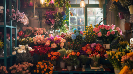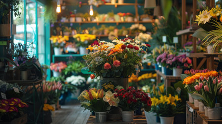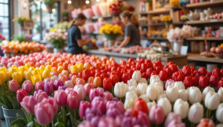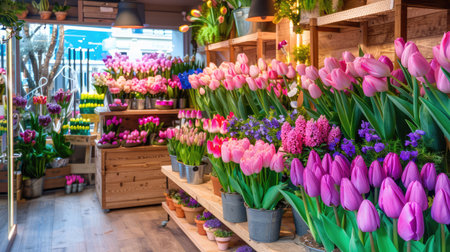 A charming flower shop filled with vibrant tulips and other spring blooms. The inviting interior showcases fresh arrangements under warm natural light, creating a cheerful atmosphere.