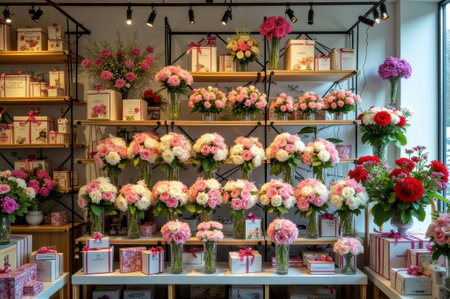 Modern flower shop interior with colorful floral arrangements displayed alongside decorative vases and gift boxes.