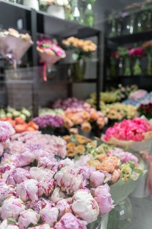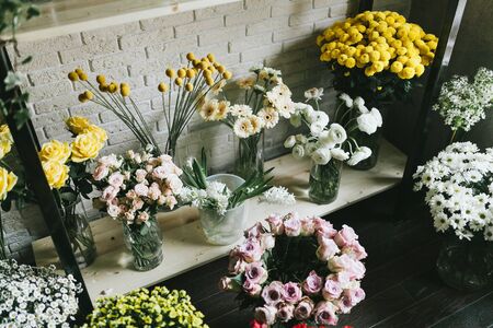 showcase flower shop. Beautiful spring bouquets. Arrangement with mix flowers. Small family business. Work florist. copy space.