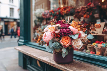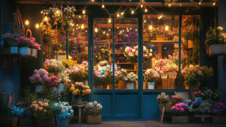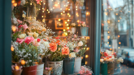 A charming flower shop window with bouquets of colorful blooms, twinkling fairy lights, and vintage decor.