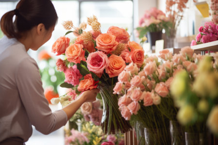 Caucasian woman arranging flowers in vibrant shop with colorful blooms and lush greenery