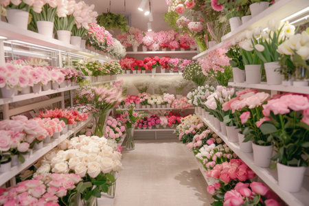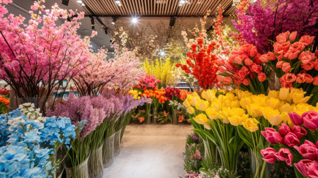 Vibrant floral shop interior with diverse blooming flowers on display. That the image is generated using AI.