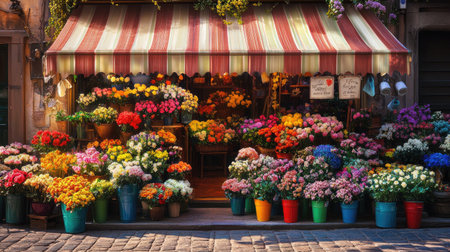 A picturesque street flower shop under a striped awning, with colorful vases of flowers and handwritten price tags on display.