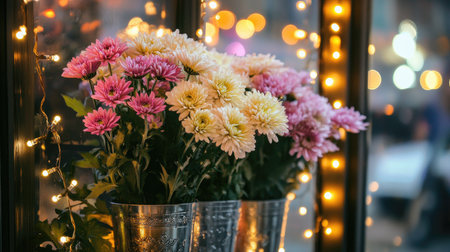 A flower shop display showcasing mixed chrysanthemum bouquets in decorative vases, styled with string lights and greenery.