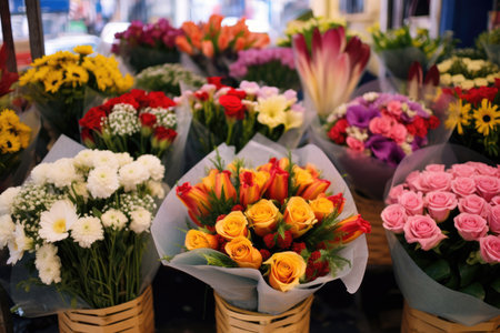 Brightly colored bouquets of roses tulips and daisies create an inviting atmosphere at a bustling flower market during daytime.