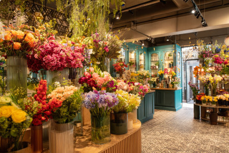 A flower shop showcases an array of colorful flowers in various arrangements. The space features green plants, stylish vases, and bright decor, creating a lively atmosphere for customers.