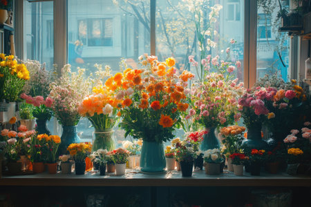 Vibrant blossoms in vases and pots create a cheerful display in a flower shop window, bathed in sunlight