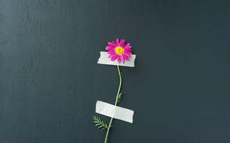 a large fresh bright pink chamomile on a green stalk is glued to a molar tape with a dark gray wall