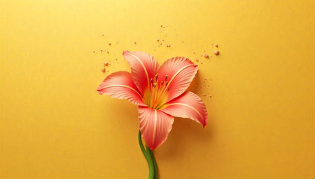 Single coral lily blossom against a warm yellow background