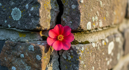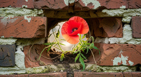 red beautiful flower growing in the middle of old bricks wall