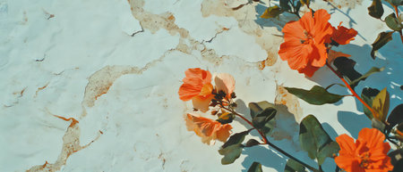 Delicate pink flowers drape gracefully from lush green leaves against a soft light wall, creating a charming and serene atmosphere ideal for floral design projects.