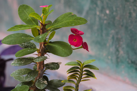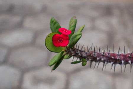 Euphorbia milii Blooming with Vibrant Red Flowers and Sharp Thorns against a Blurred Stone Background, Symbolizing Resilience and Beauty
