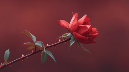 A stunning close-up of a red rose on a thorny stem against a softly blurred background. This image highlights the flower's vibrant color and delicate beauty.