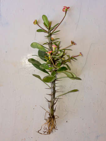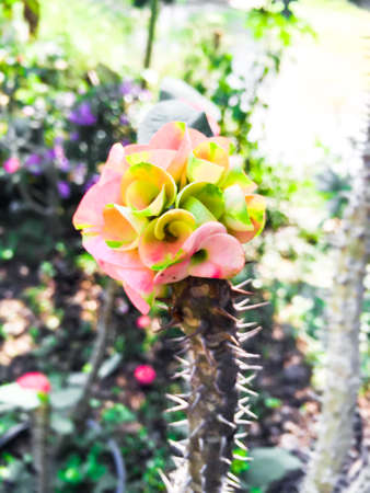 Christ Thorn, Euphorbia milii or Euphorbiaceae or Euphorbia milii Des Moul or Crown of thorns or Christ thorn or pink flowers
