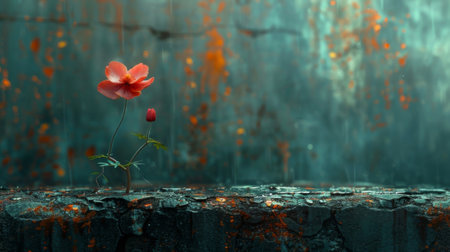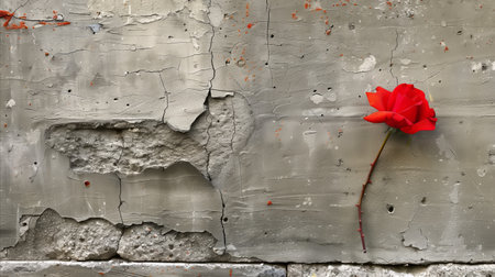 A bright red rose pops against a decaying gray textured wall, symbolizing beauty amidst decay and the concept of hope and renewal.