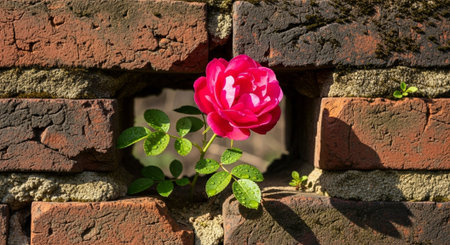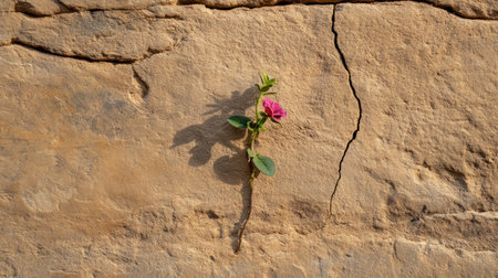 A striking pink flower emerges from a crack in a weathered stone wall, symbolizing resilience and beauty in nature. The sunlight casts a soft shadow.