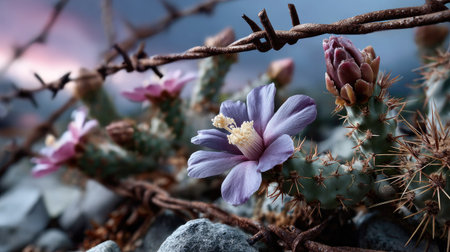 A striking close-up of delicate cactus flowers blooming in a harsh environment, entwined with barbed wire against a rocky background, captures nature
