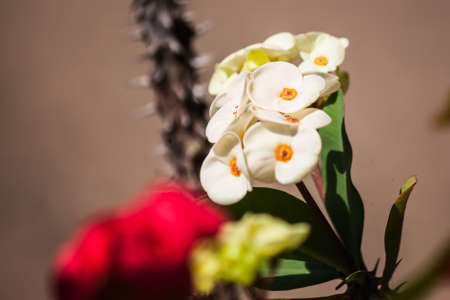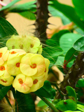 Close-up shot of the beautiful and brightly colored flowers of the Christ Plant (Euphorbia milii), also called the Crown of thorns or Christ thorn.