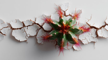 Cactus plant cracked and flaming in the center, set against a clean white background for dramatic effect