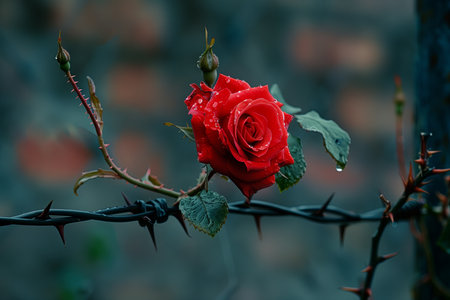 A close-up captures a crimson rose encircled by sharp, metallic barbed wire, resting on earthy ground. The image displays a shallow depth of field, with soft lighting and a warm color palette. The composition evokes a sense of contrast, possibly suitable for editorial or conceptual projects.
