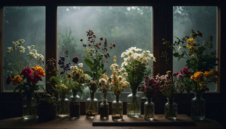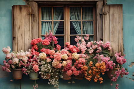 Cozy interior window frame with an array of beautiful, colorful flowers overlooking a scenic landscape