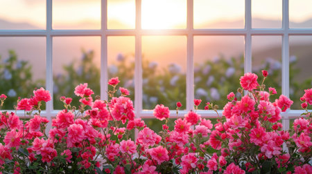 A vibrant arrangement of pink flowers adorns a sunlit windowsill, creating a serene and beautiful scene.