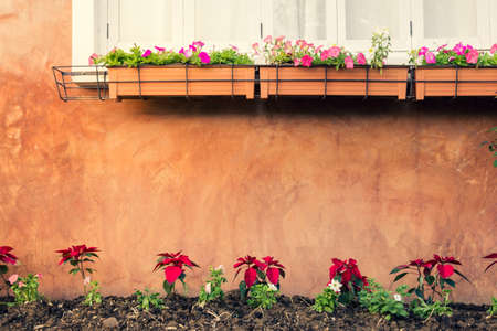 Beautiful flower garden in front of the orange wall with warm sunlight in the morning.
