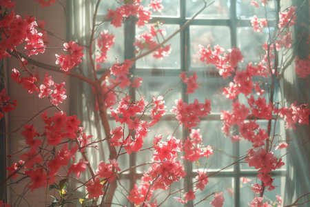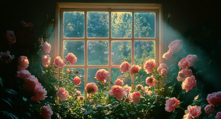 Delicate peonies bloom vibrantly around a sunlit window, filling the space with color and light. The soft rays illuminate the garden, creating a serene and inviting atmosphere.