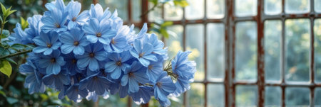 Blue flowers blooming in rustic greenhouse with sunlit windows. That the image is generated using AI.