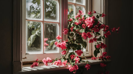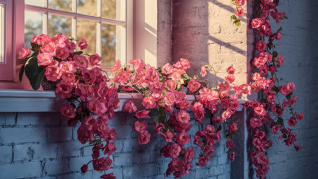 A profusion of pink flowers cascades from a windowsill bathed in warm sunlight creating a picturesque scene.