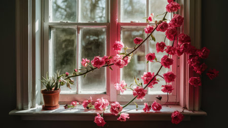 A vibrant arrangement of pink flowers cascading across a sunlit windowsill, accompanied by a small potted plant.