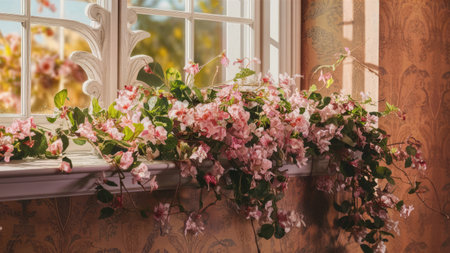 A lush arrangement of pink flowers cascades from a windowsill onto an ornate patterned wall.