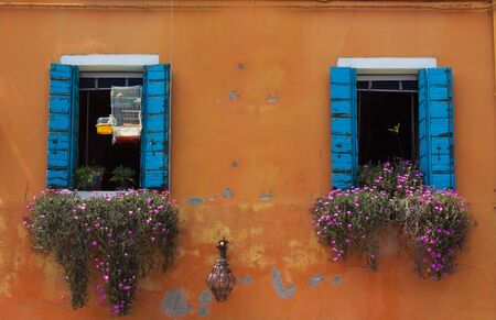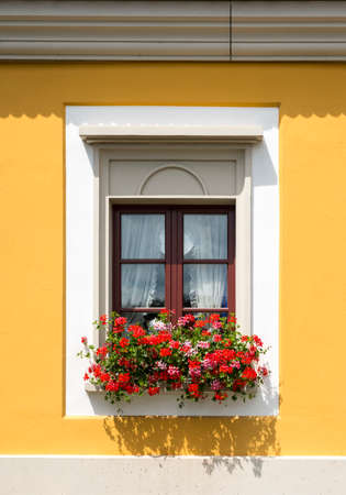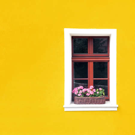 Window with flower box. Italian architecture background. Vibrant color yellow wall facade. Small town house exterior. Street of European city building. Empty copy space wall. Square shape view.
