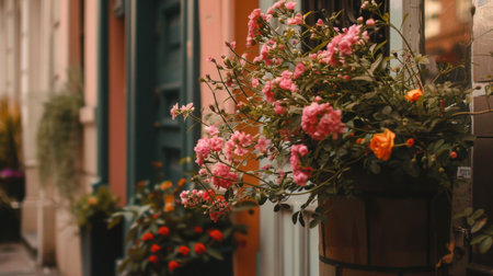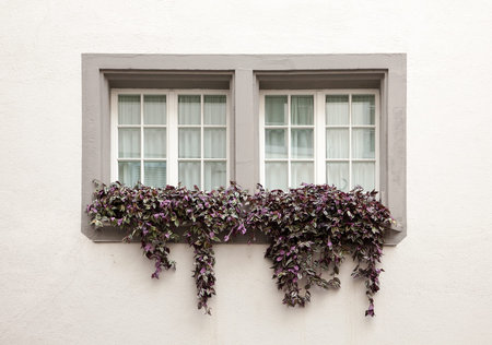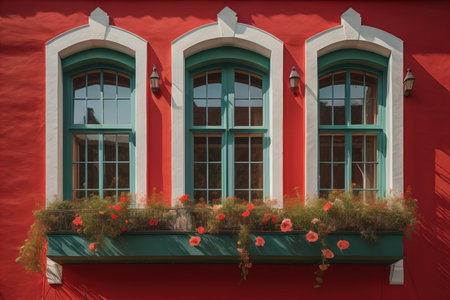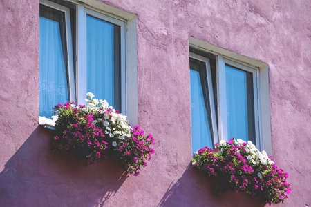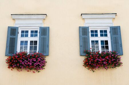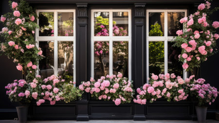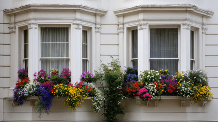 Charming image of flower boxes overflowing with vibrant blooms on two elegant windows, reflecting the beauty of urban gardening in summer.