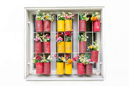 Window decorated with red flowers. White window surrounded with red flowers. Rustic wooden window with red flowers.