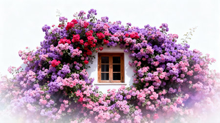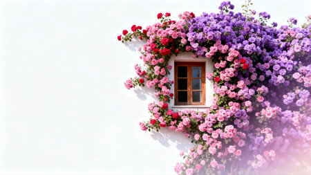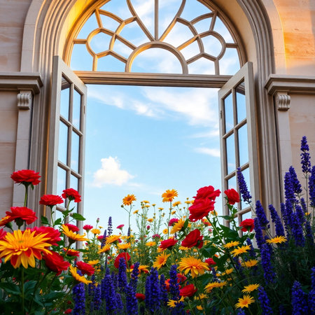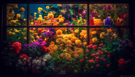 A vibrant view of colorful flowers through a window, blending the beauty of nature with a serene home interior. Perfect for representing tranquility and freshness.