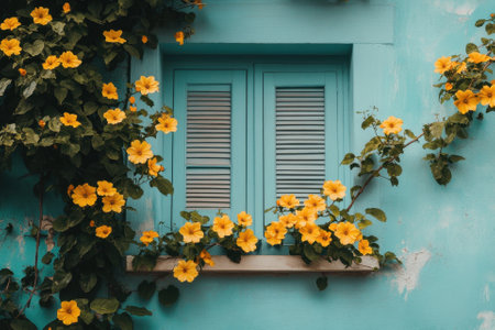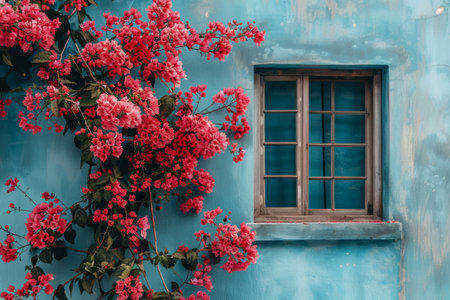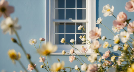 AI Generated. Charming Blue Wall Adorned With a White Window and Blooming Flowers on a Sunny Day