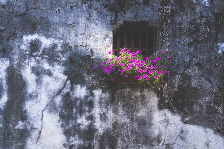 Forlorn Beauty: An Unveiling of Flowers Beside a Barred Window -ar 3:2
