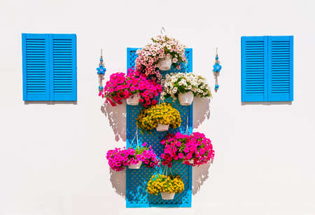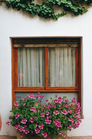 A closeup of an old-style window frame and colorful flowers in the yard, Cascais, Portugal