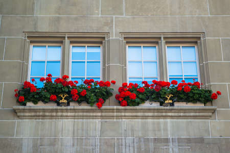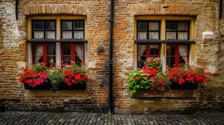 A picturesque view of a charming brick wall featuring two windows adorned with vibrant flower boxes filled with red and green geraniums.