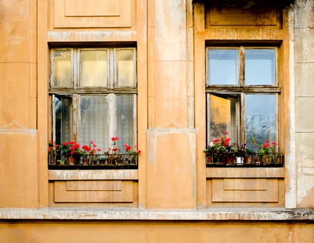 Windows of a pastel colored house in the old part of Kyiv, Ukraine