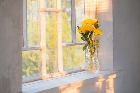 Morning light enters through the window, illuminating vibrant flowers arranged along the sill with green landscape outside.